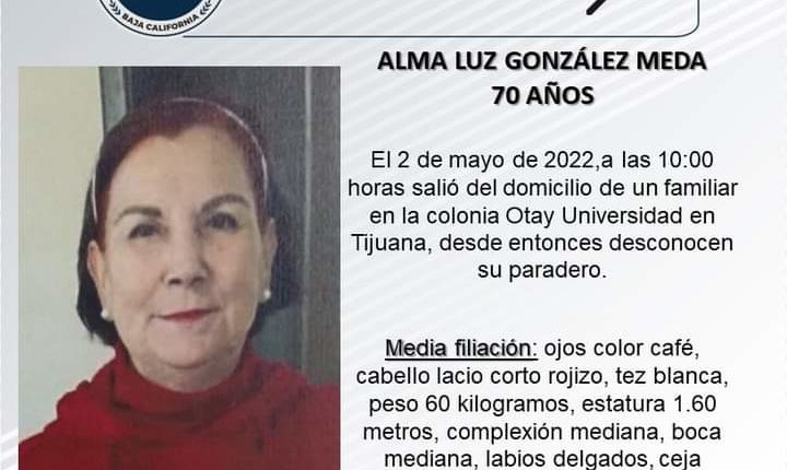 La señora González fue vista por última vez el pasado lunes 2 de mayo, cuando salió del domicilio de un familiar en la colonia Otay Universidad a las 10:00 de la mañana.