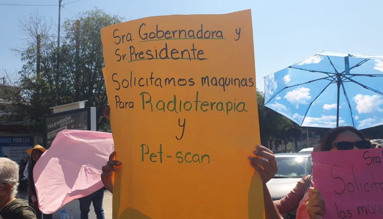 Tijuana, 7 de julio de 2023.- Pacientes con cáncer se manifestaron para exigir a la gobernadora del estado que instale el equipo de radioterapia que prometió.
